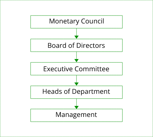 Corporate governance at the Bank is aimed at encouraging innovation through critical thinking and development through problem solving, in order to meet the Bank’s objectives and to provide accountability and control systems commensurate with the risks involved. The Bank’s corporate governance framework is set by the Agreement, which provides for a Monetary Council (the highest decision-making body) and a Board of Directors (the Board). Also incorporated in this framework are three management committees created by the Governor: Executive Committee; Heads of Department Committee; Management Committee (see Figure 1). These committees are essential for the implementation of policies of the Board, and the conveyance and exemplification of its core values.