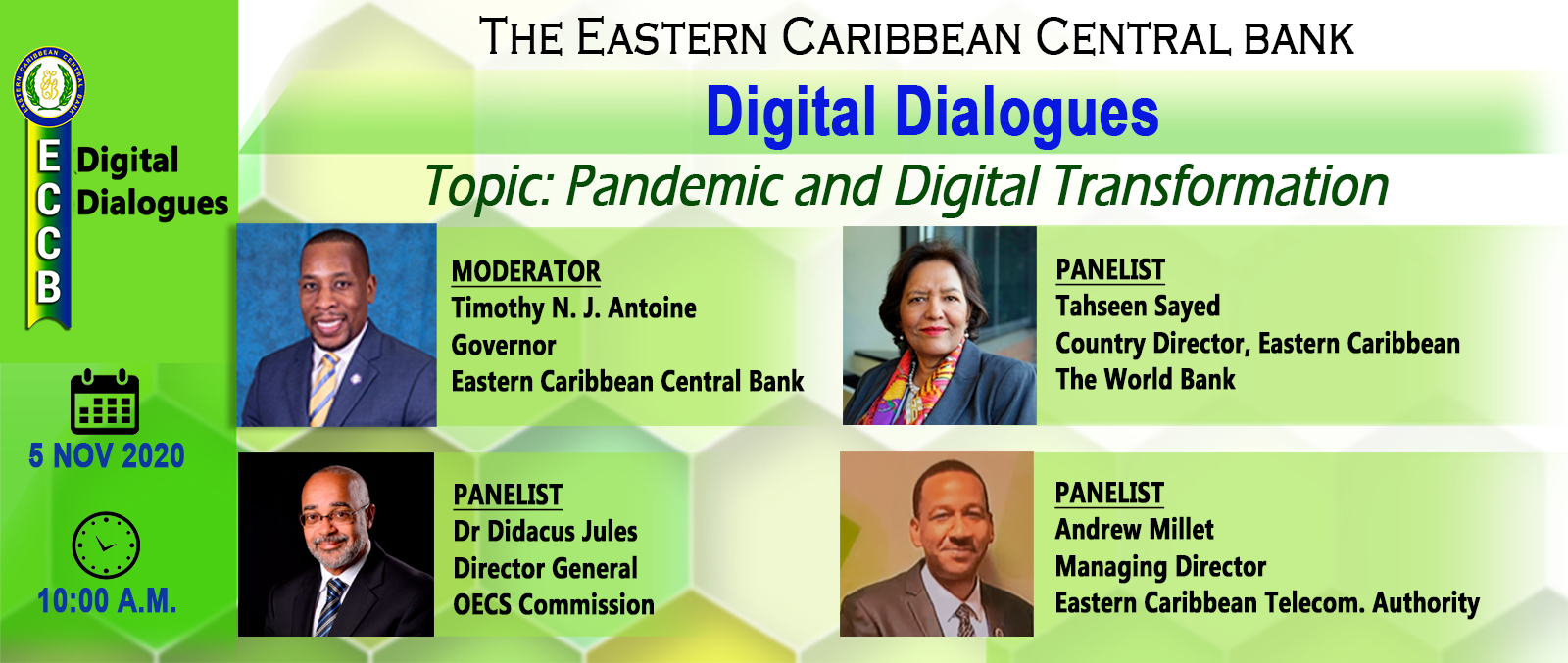 Join Governor of the ECCB, Timothy N. J. Antoine as he moderates a live and interactive ECCB Digital Dialogue on the transformation of our economies and societies through digitalization.